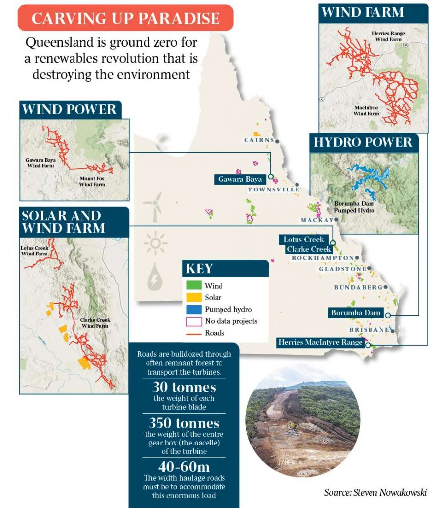 University of Queensland ecology professor and Biodiversity Council co-chairman Hugh Possingham says land-clearing for renewables is boosting carbon dioxide emissions, “making climate change worse”. Mountain wind farms are of particular concern: “The highest concentrations of birds and mammals are in the mountains where these projects are. Areas of high value for biodversity are being impacted and they should not be impacted.”