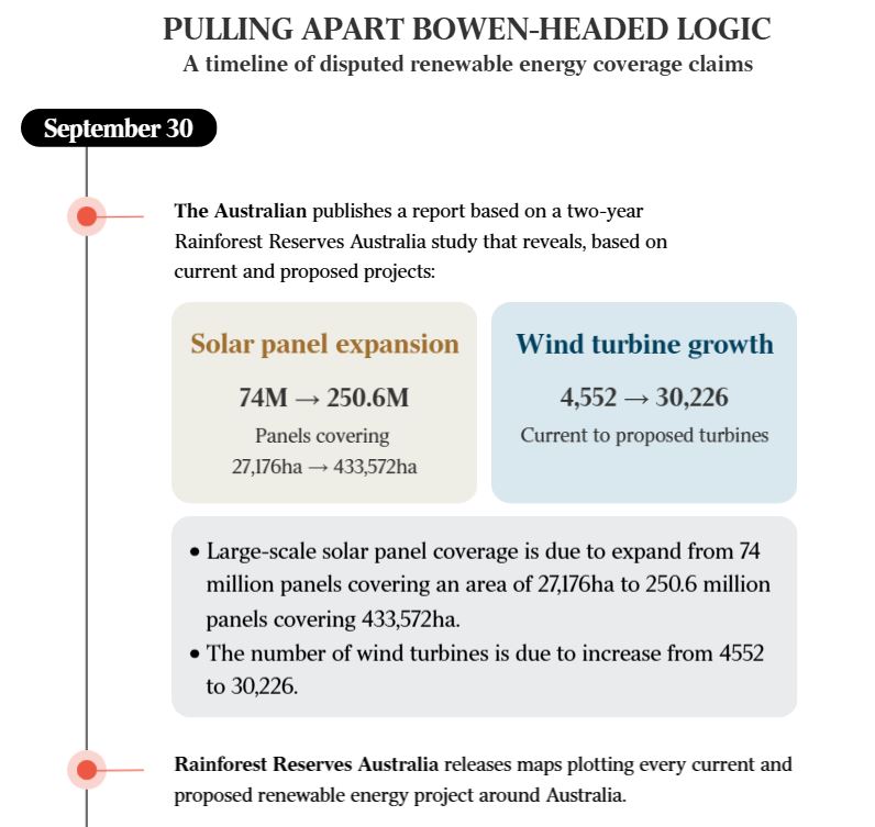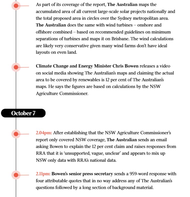 In the video posted to social media, Mr Bowen claims the area to be covered by renewables is 12 per cent that revealed in the RRA data and featured in graphics in The Australian relating their overall footprint to metropolitan Sydney and Brisbane. He said the 12 per cent figure was based on calculations by the NSW Agriculture Commissioner of “how much land renewables will take, based on the plans of the Australian Energy Market Operator”.