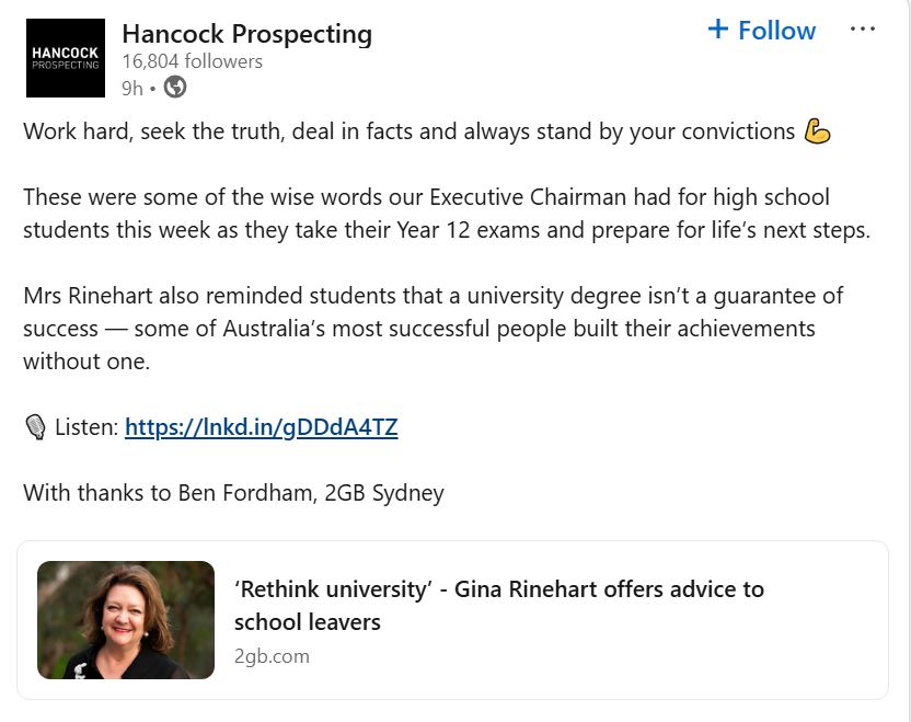 Mrs Rinehart also reminded students that a university degree isn’t a guarantee of success — some of Australia’s most successful people built their achievements without one.